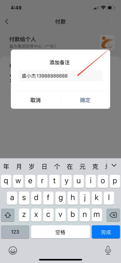 2、付款前请按照如下页面添加备注,填写姓名和报名时预留的手机号(如:盛小杰13988888888)确定无误后付费。